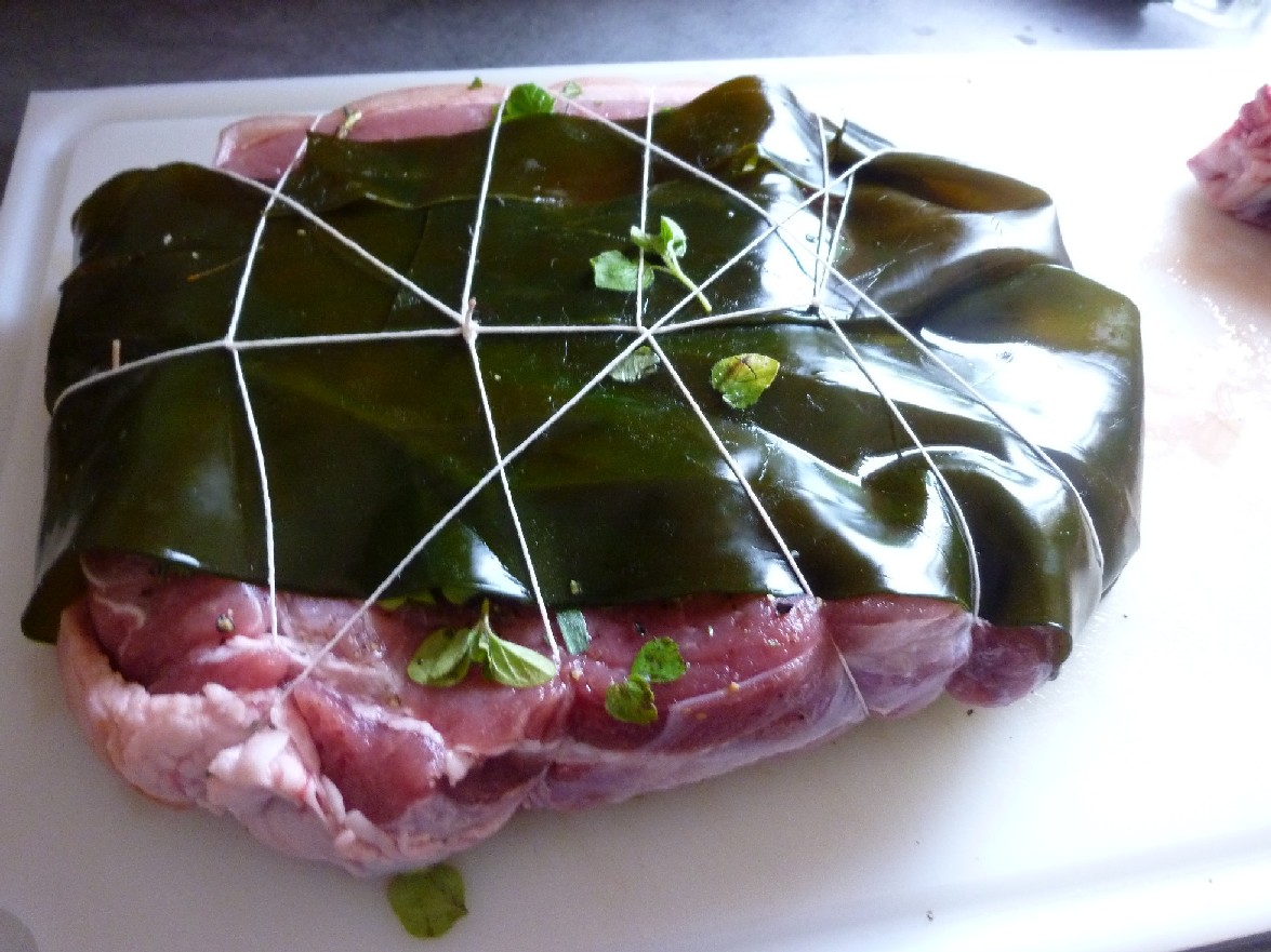ROUELLE DE JAMBON FERMIER AUX HERBES, BARDEE DE LAMINAIRE