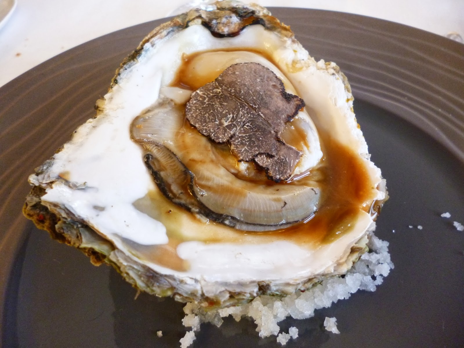 Elle est juste pochée rapidement pour la raffermir puis remise dans sa coquille avec un jus truffé et une lamelle du même diamant.